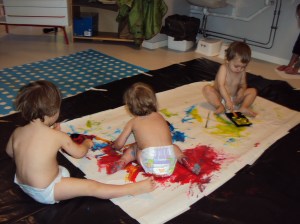 Av med alla kläder och endast iförda blöjan använde barnen hela sin kropp vid utforskandet av fingerfärgen, detta för att stimulera känselsinnet så mycket som möjligt.